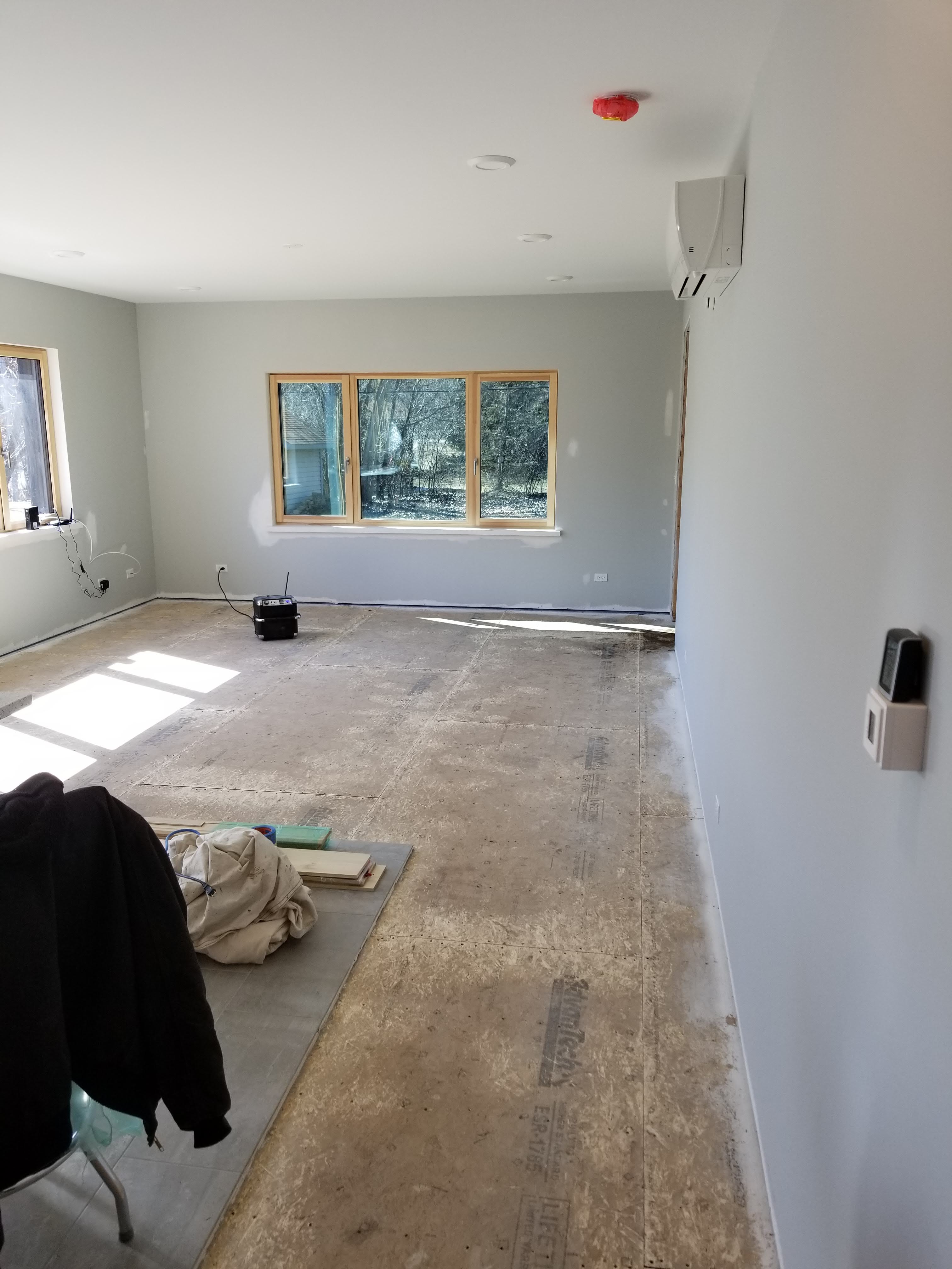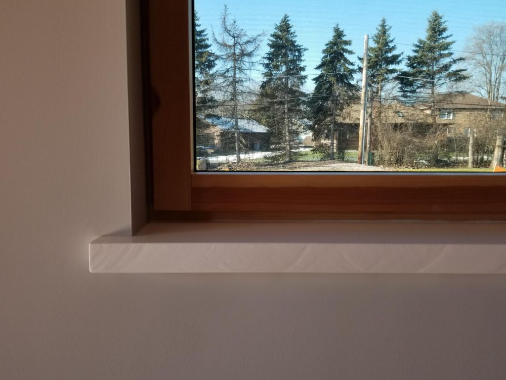 Around exterior doors and windows we chose to utilize drywall returns rather than more elaborate wood trim details. The exception was for our window stools. Here, we went with 8/4 poplar. The thicker material goes well with the chunky profile of our passive house doors and window sashes, particularly noticeable when the units are open.