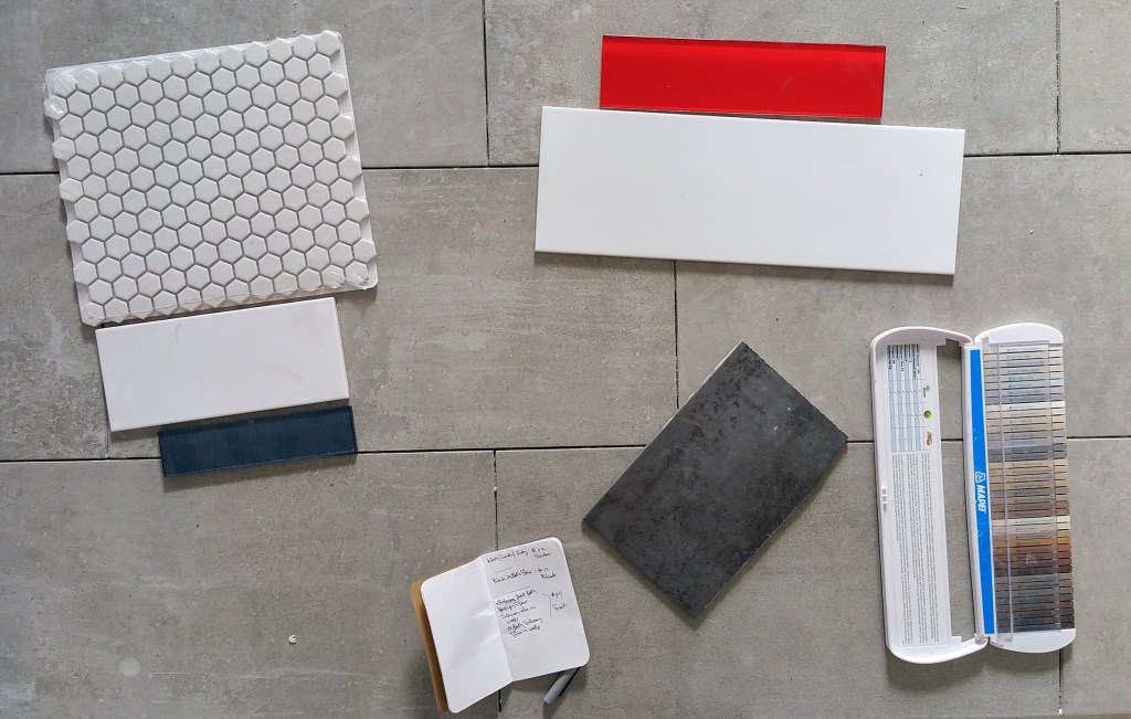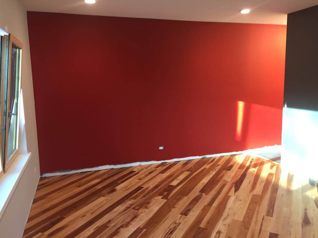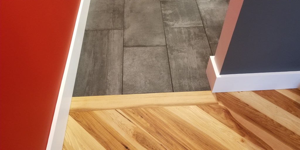 The combination of ‘weathered concrete’ porcelain tile with the warmth of the hickory mimics the contrast between dark, cool gray and rich red on the adjacent walls.