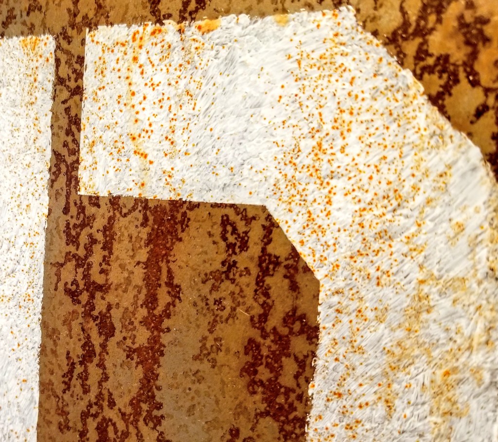 The white letters were painted on prior to the seal coat because I wanted some of the rust to bleed through the paint for a more weathered effect to match the level of rust: