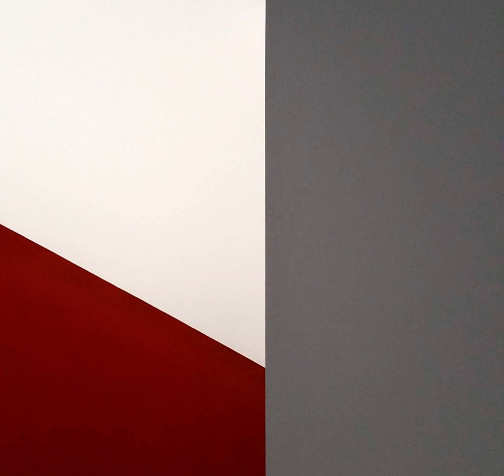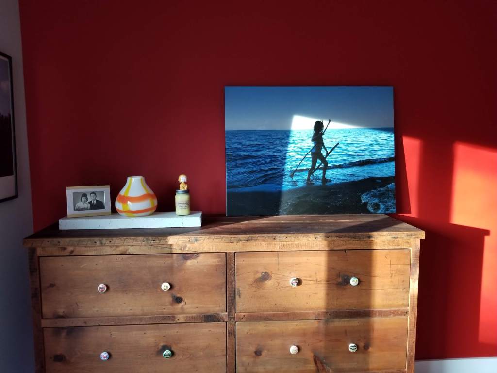 Below, afternoon sun breaking across the photo and the red accent wall: