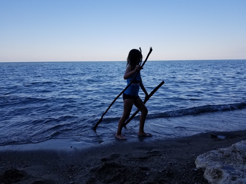 For our red accent wall I decided to use an image of our daughter playing on the Chicago lakefront at sunset. The rich blues in the failing light accentuate the water theme I was after: