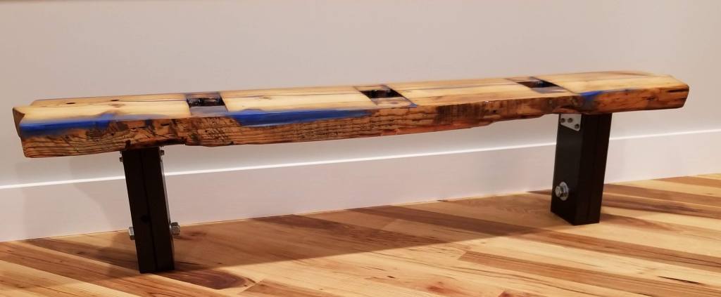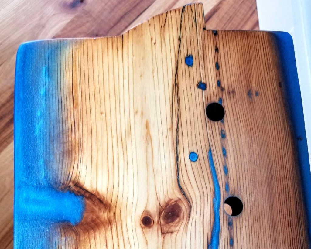 Building up some of the outside edges not only added to the visual effect, it also helped stabilize what would’ve otherwise been a piece on the verge of falling apart. This section of wood was a structural framing component during its working life. I left some of the larger holes empty (these look like they were for conduit), while concentrating on the smaller voids. In addition, the mortise pockets benefited from some of the blue epoxy, giving these areas a look of pooling water while also making these spots easier to dust and keep clean: