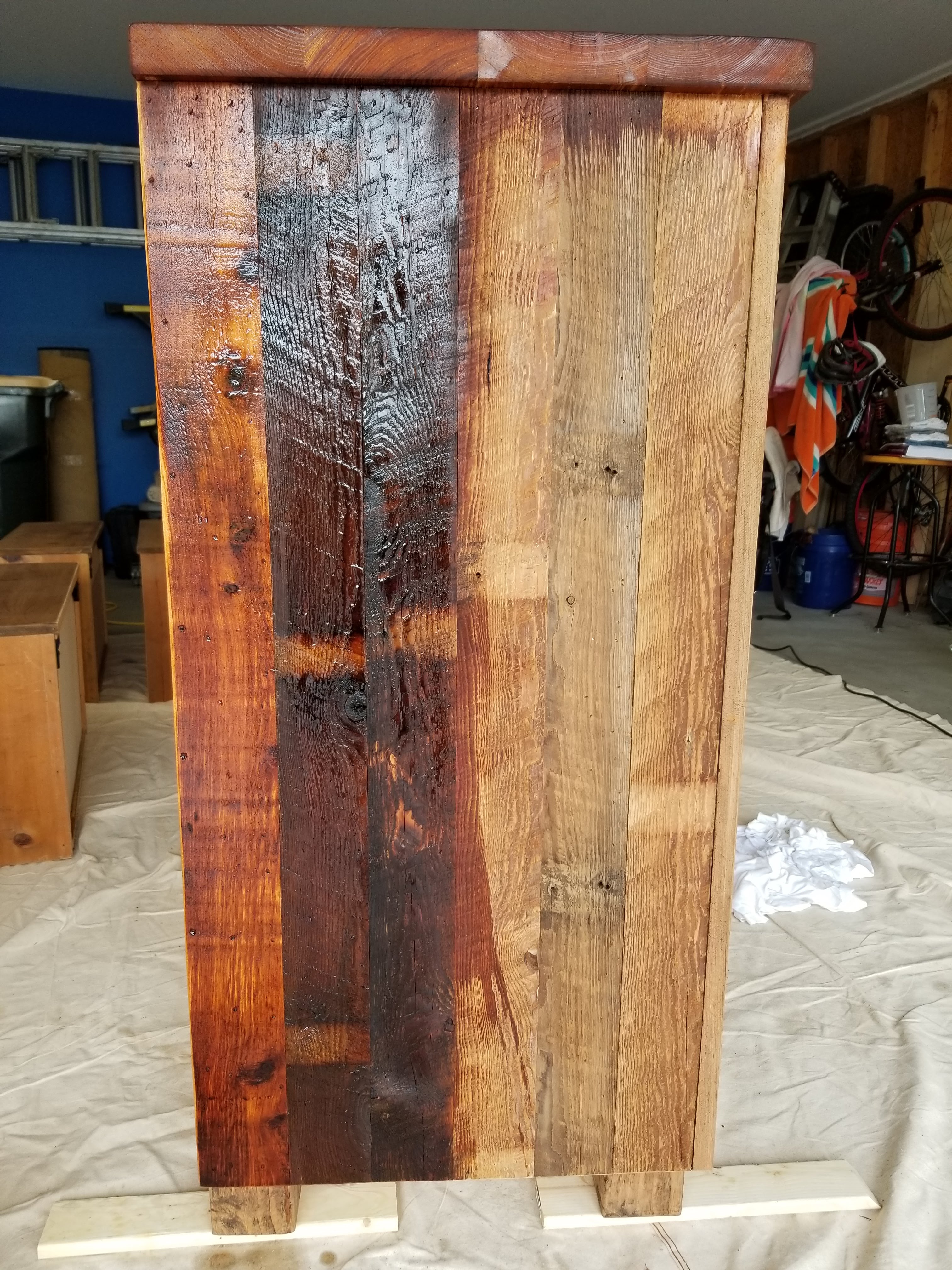 My daughter helped me apply tung oil to the ‘box’ and the drawers, giving the dresser a warm, natural matte finish. After a final sand and wipe down, the tung oil brings the old, dry looking wood grain back to life: