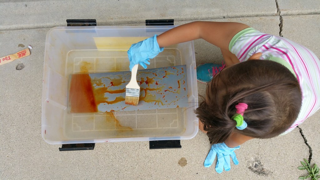 There is some latitude in controlling this chemical reaction as the metal rusts. Minimizing the time of exposure can allow some of the original bare metal color to remain. With a longer soak, and some brushing of the liquid repeatedly over the surface of the metal, a much deeper, all-encompassing level of damage can be achieved.