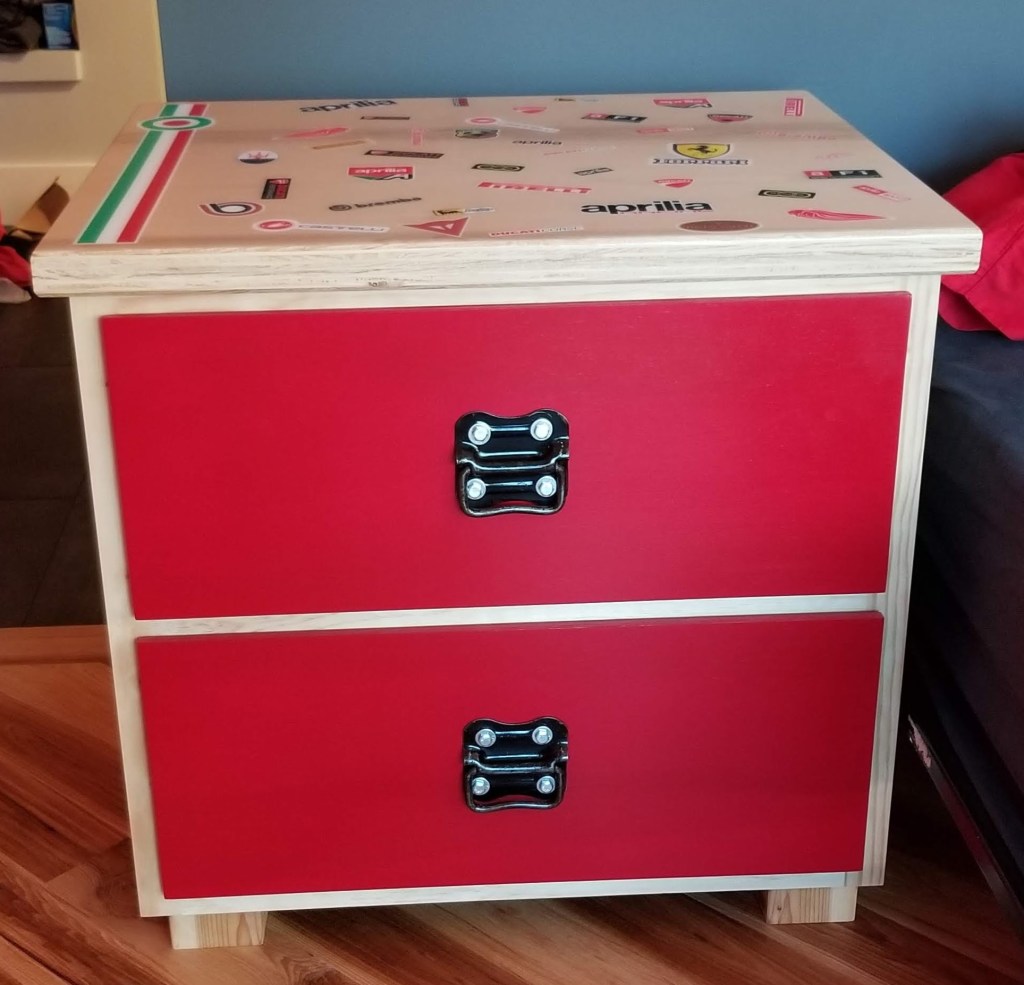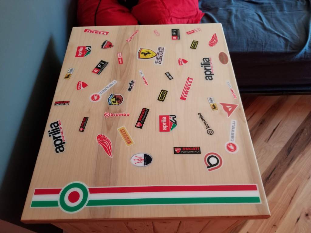 With a slightly rounded over edge created using a router, it was time to have some fun applying stickers. Starting with a Vespa Italian roundel and striping, my daughter and I added various other famous high-performance Italian industrial design brands, partly inspired by the work of Bruno Munari.