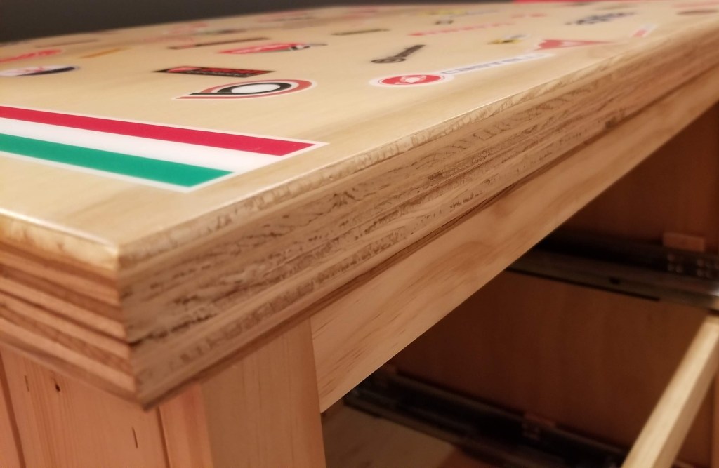For the top I glued two sheets of 3/4″ Purebond plywood together for a chunkier look, using Timbermate putty to fill and smooth out the exposed edges.