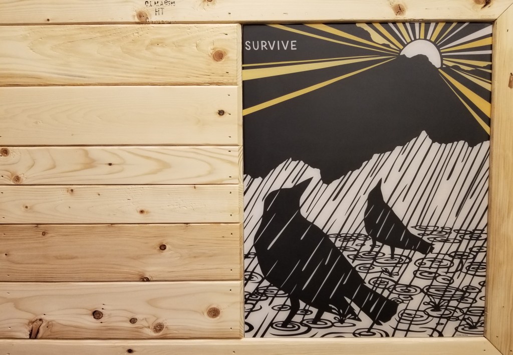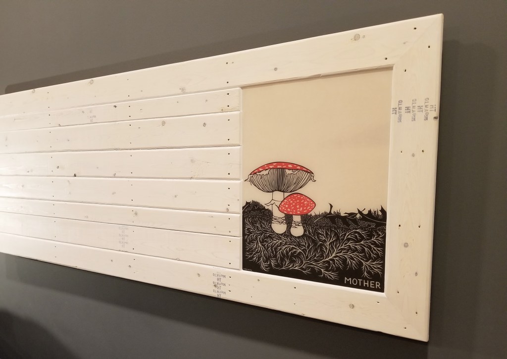 As with the ‘Mother’ piece, I tried to hold onto the lumber stamps as much as possible. I also tried to select the individual pieces of 1×4 for their color, wood grain, and knot pattern. This was more important for this piece since it was left ‘natural’, with only a couple coats of Osmo for some protection and for a slight ambering effect. The natural tones of the wood and the inky black in the artwork make for a nice combination with the intensity of the red on the wall: