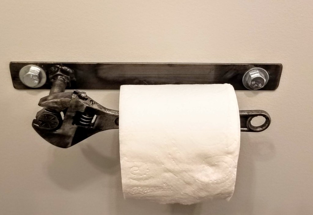 Struggling to find a unique toilet paper holder, I came across this one on Etsy: Wrench