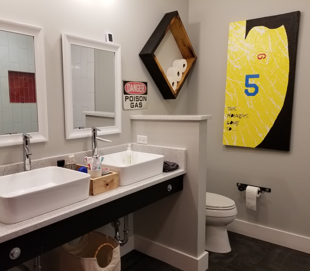 To create a warm, inviting bedroom and bathroom we knew we wanted to incorporate the same basic Urban Rustic design elements that we intended to use throughout the house. At their most basic level, these elements include wood, metal, and concrete (or stone). These show up at the largest scale in our hickory wood floors, our ‘stained’ concrete porcelain tiles, and our quartz countertops (kitchen and bathrooms). On a much smaller scale, these elements show up in variety of decorative objects that we have carefully curated, placing them throughout the house.