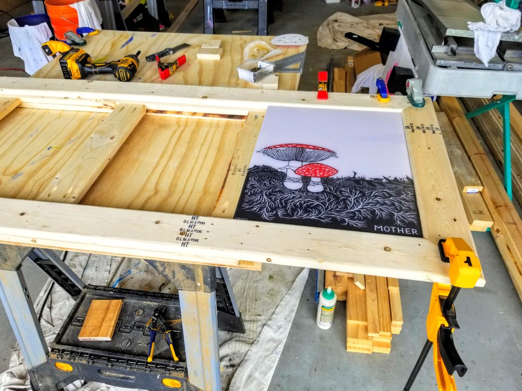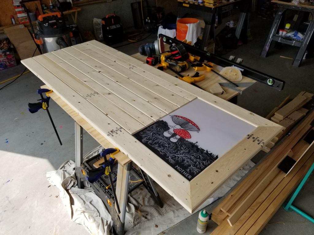 With a base frame made of 1×4 furring strips, I attached the print and then surrounded it with additional 1×4 furring strips to create the finished surface:
