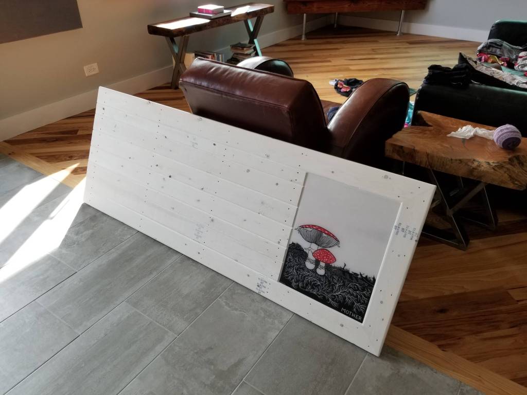 For our headboard wall we started with a print by Nikki McClure. We really enjoy the playful vibrancy in her work. The print was mounted and finished with epoxy and then the Osmo as outlined above.