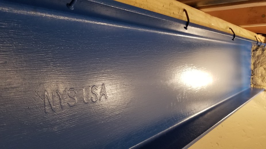 Exiting the kitchen, on the way to the bathroom, reveals a linen closet area. Here, I again opted for open shelving, with 2×10’s and gas pipe. The advantage of the open shelving is always knowing what you have and when to order or buy more. The downside, of course, is that there’s no place to hide from dust and clutter if things are allowed to get out of hand.