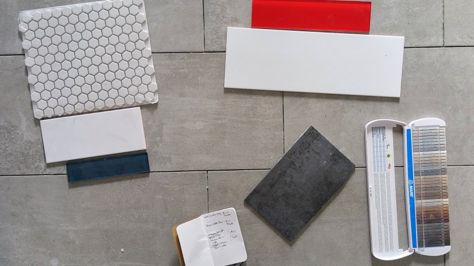 In this second bathroom, we opted for white hexagon tile for the floors, including inside the shower. For the shower walls, we used vertically oriented oversized white subway tile with blue glass accents.